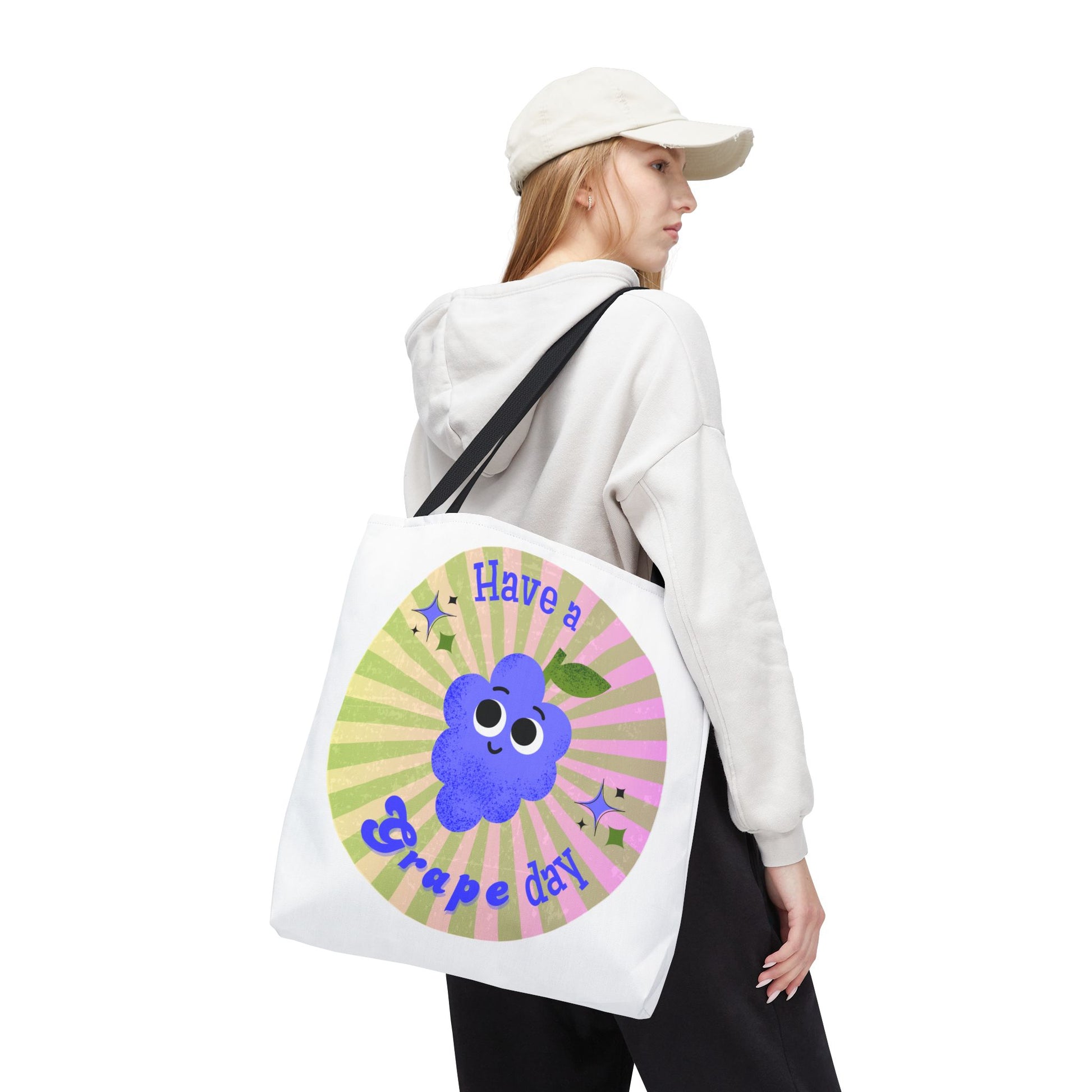 Introducing our vibrant Tote Bag, designed to brighten your day! This delightful accessory features a whimsical grape character and the cheerful phrase "Have a Grape Day," giving off a fun and uplifting vibe. Perfect for grocery runs, beach days, or simply to carry your daily essentials, this tote brings joy wherever you go. It's ideal for friends, family, or anyone who loves playful, colorful designs. Great for birthdays, special occasions, or just as a treat for yourself. Whether you're heading to a picnic or a casual day out, this tote will make you smile!